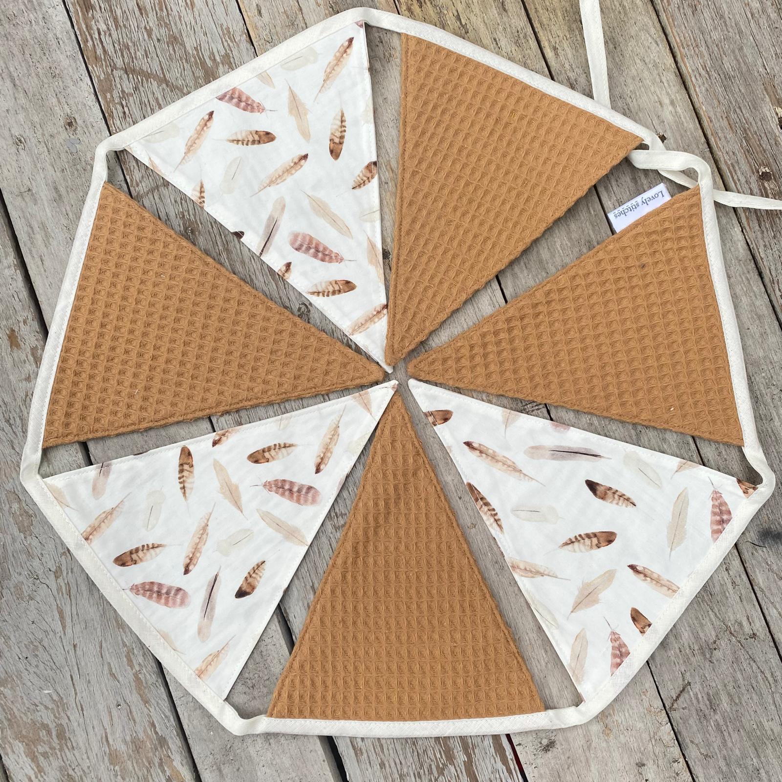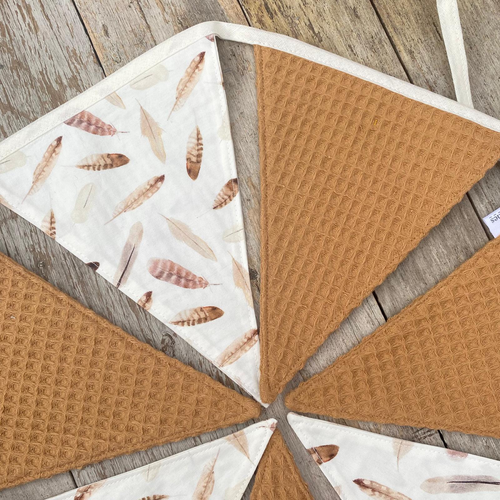 De vlaggenlijn bruine veren met camelkleurige wafelstof van Lovely Stitches is een stijlvolle en tijdloze decoratie. Deze vlaggenlijn is handgemaakt in eigen atelier en met zorg samengesteld uit hoogwaardige materialen. De combinatie van zachte natuurtinten en speelse details maakt deze katoenen vlaggenlijn perfect voor een warm en rustig interieur.